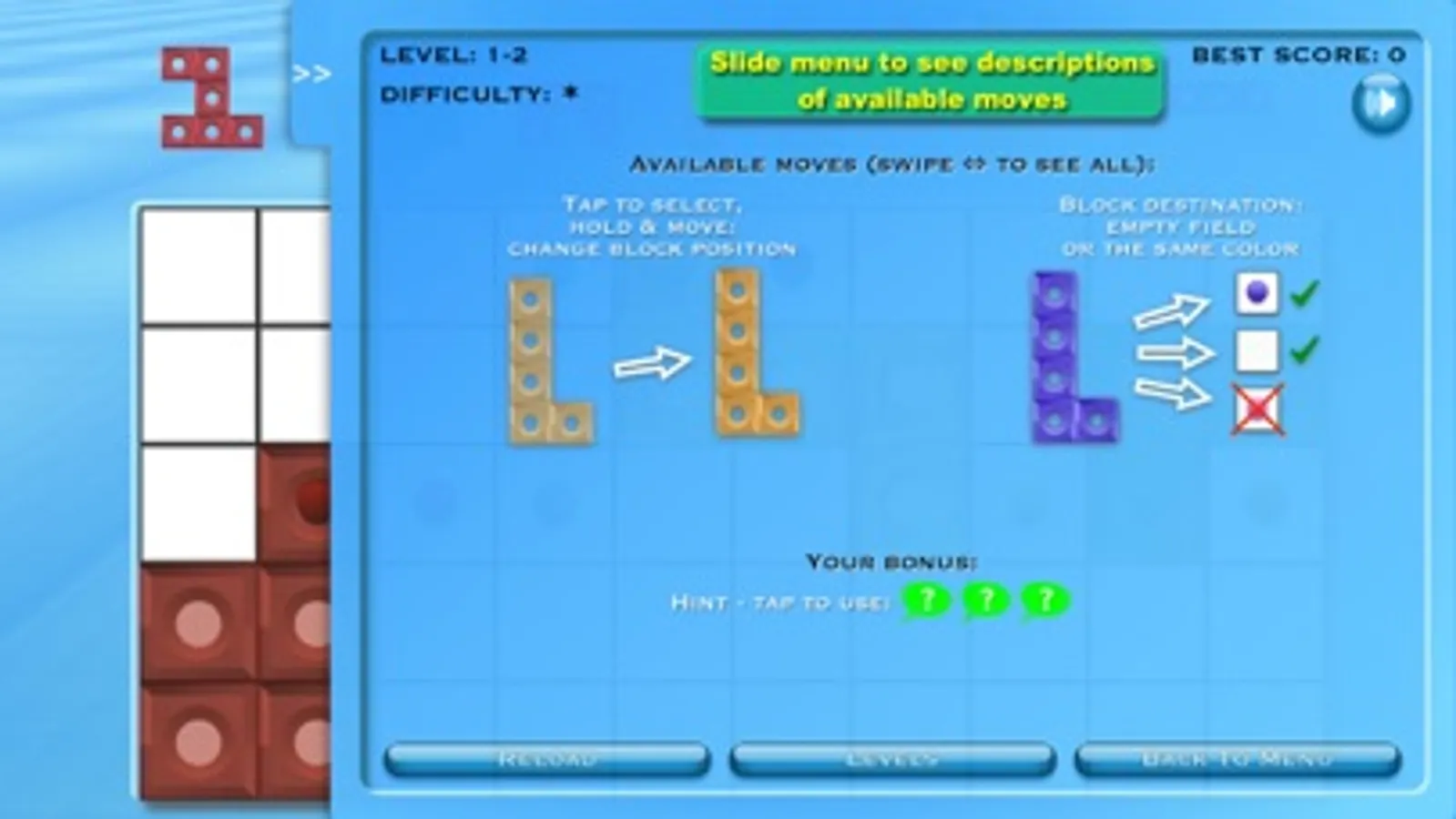 * available moves depends on the game level: movement, rotation, mirror image;