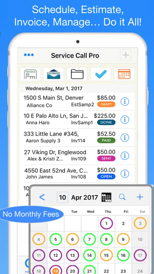 Service Call Pro is a complete management app for all types of professional in Field service providers. It maintains a client focused schedule of your appointments. Integrated with your client contact info you can quickly create invoices and track your important accounts.