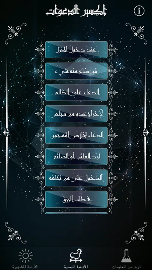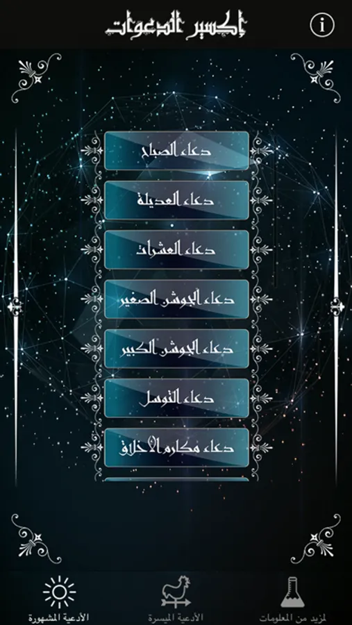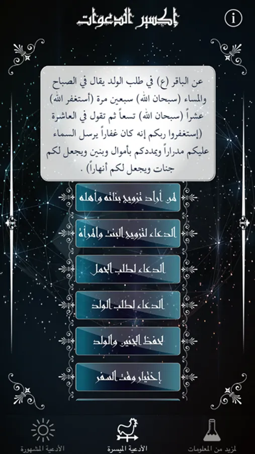 هذا التطبيق “إكسير الدعوات” يحتوي على أدعية عظيمة الشأن جليلة القدر التي تفك أقفال المعضلات وتقضي جميع الحاجات منها فرائد الأدعية العرفانية, وقلائد الأحراز السليمانية, وجواهر الخواص القرآنية, وحجب الأمان الرضوانية, وكنوز الفوائد الرحمانية ما يبطل الأسحار الشيطانية ويجلب الأعمال الإحسانية
