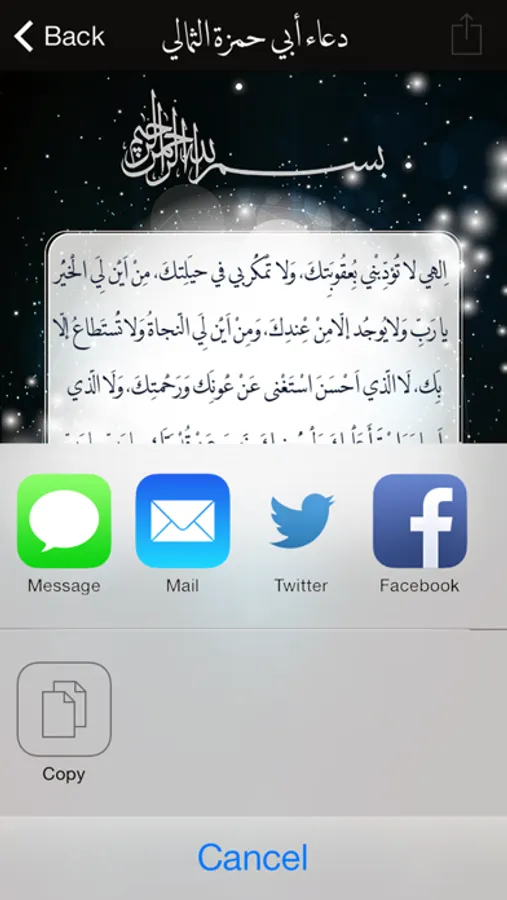 - إمكانية إرسال الأدعية بواسطة تطبيقات التواصل الإجتماعي:Email, Whatsapp, SMS, Facebook, Twitter, copy, وغيرها من التطبيقات.