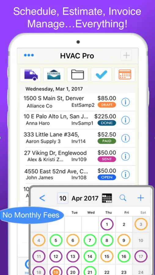 Specifically designed for HVAC and mechanical professionals. It maintains a client focused schedule of your appointments. Integrated with your client contact info you can quickly create invoices and track your important accounts.
