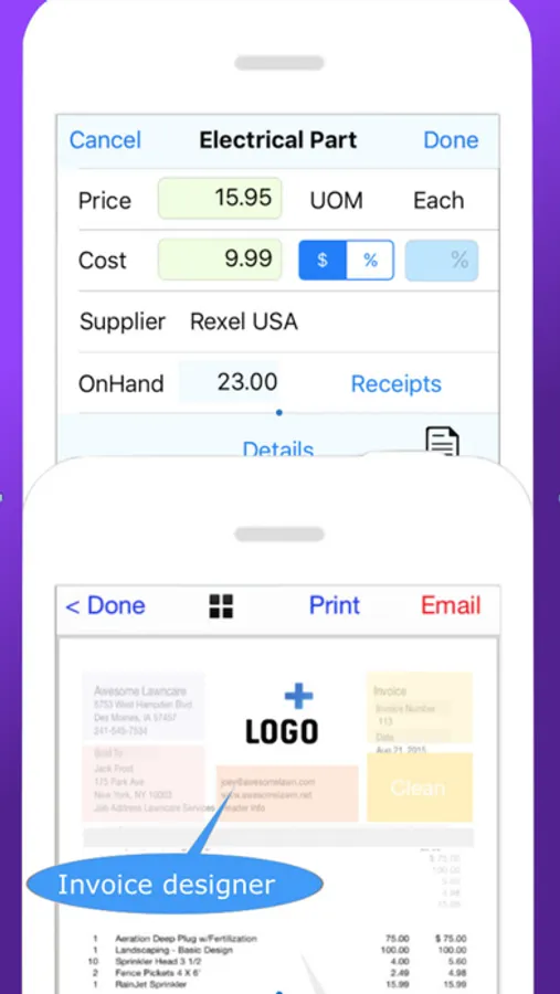 Labor, Parts & Supplies are maintained in the app with detailed multi-line descriptions, costs, price and units of measure & on hand quantities. These can be added on-the-fly or maintained from your stored items.