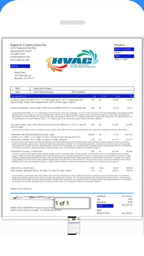 Invoices are automatically created from your Estimates and support multiple payment methods. Maintain PAID and OPEN status of your invoices. Multiple sales tax rates. Your logo, detailed terms and conditions and other messages are automatically displayed.