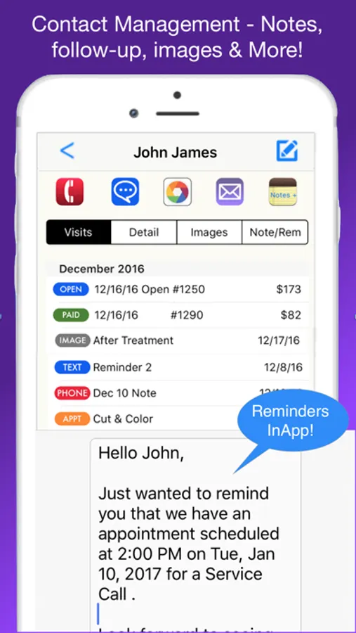 Contact Management - Store notes, images and track other communications with your clients and have the in app ability to call, text, email or map without leaving your app.
