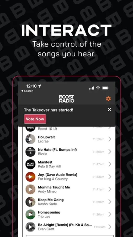 In the BOOST RADIO app, you can get to know the performers. Direct Message the DJ's live in the studio. Vote for songs you want more of. Get free song alerts. Stream our Mix Spot shows. Lecrae, NF, Andy Mineo, KB, Wande, Evan Craft, nobigdyl, Tedashii, and Hollyn are just a few of the artists you'll hear on BOOST RADIO.