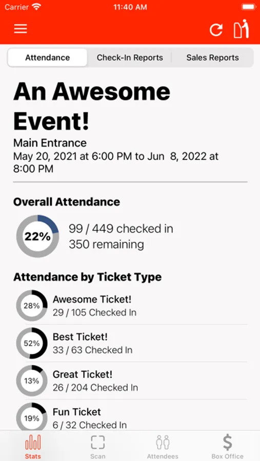 - Up the the minute view of the check-in progress for your event, see how many you have checked in with our easy to read attendance progress bar