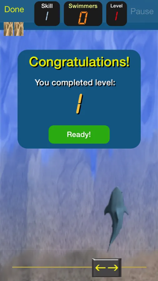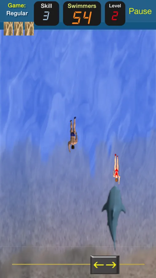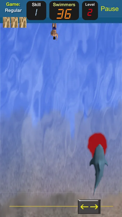 You're the shark, how many swimmers can you eat? Move your shark from side to side eating the swimmers as they swim to the beach. Eat the number of swimmers needed to complete each level. Each level gets more challenging. If you miss a swimmer he/she will swim safely to the beach. If you miss too many swimmers the game is over! Complete all the levels and you Win the Game!