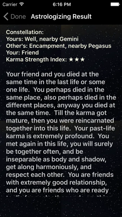 “The Astrology for Your Karma” astrology is the Buddhism astrology. Its advantage is that it can work out the karma between you and someone in your many past lives, this life and many future lives. You only need to input the birth dates, months and years of yourself and the other side, and then you can carry out the astrology.