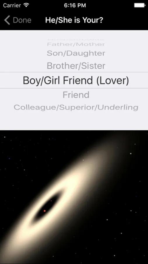 1. Husband/Wife; 2. Father/Mother; 3. Son/Daughter; 4. Brother/Sister; 5. Boy/Girl Friend (Lover); 6. Friend; 7. Colleague/Superior/Underling.