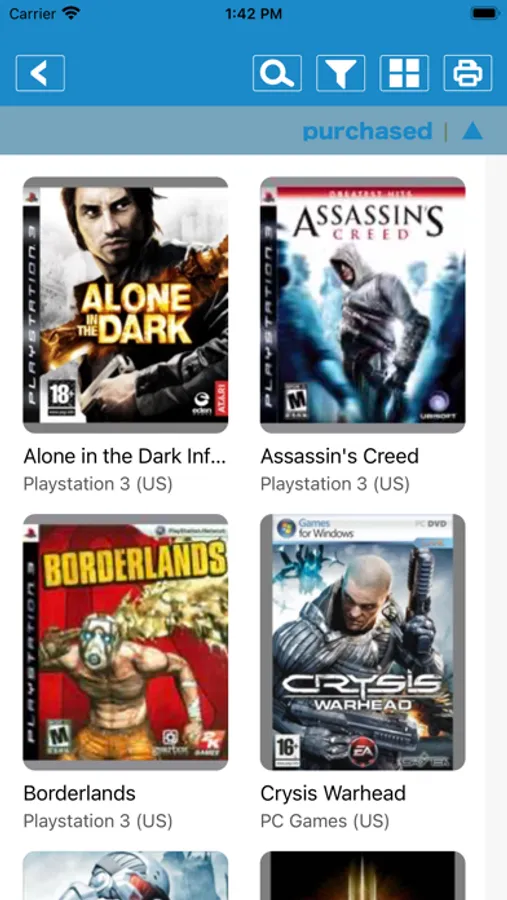 Access your collection from every device, search for a video game, sort the list by title, year, console, or purchase date, and filter the copies by console, condition, or format.