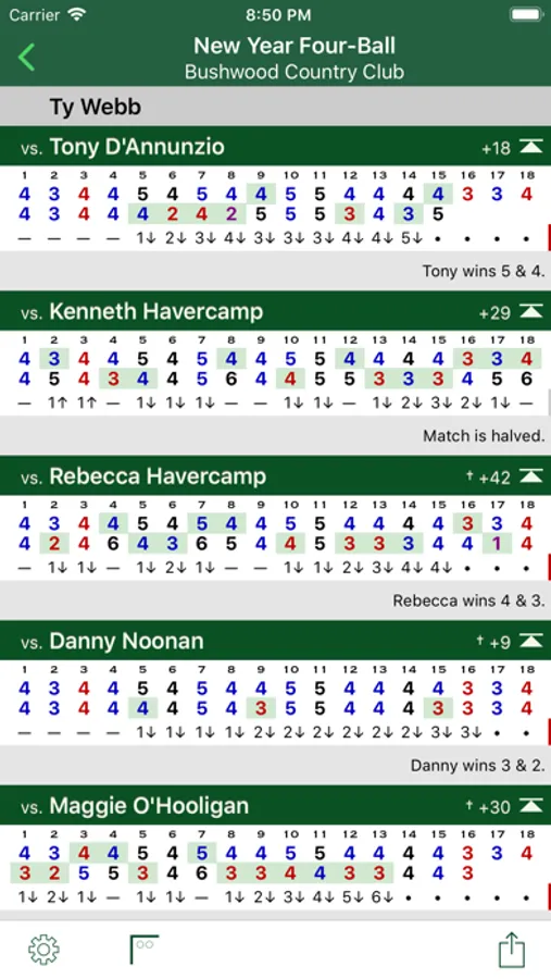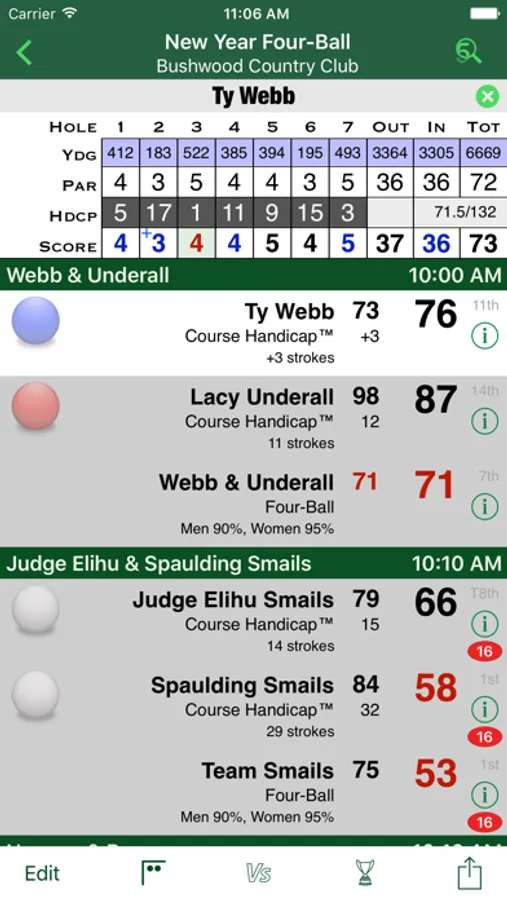 Organize and score for yourself, your foursome, your team, or a whole golf event. Keep accurate individual and team scores for dozens of kinds of play, including medal (stroke) play, match play, best-balls, foursomes, scrambles, Chapman, Stableford, Chicago and more. Use appropriate handicaps for every form of play. Handle skins and wagering automatically.