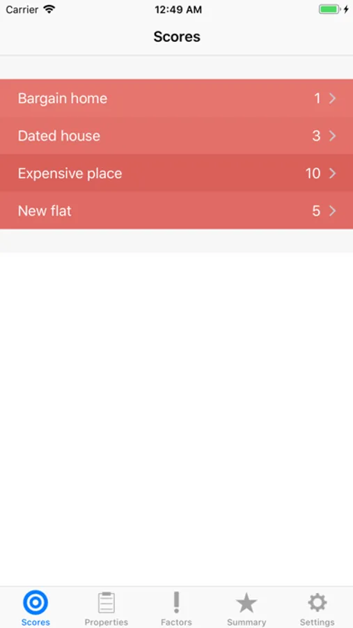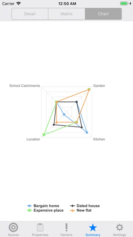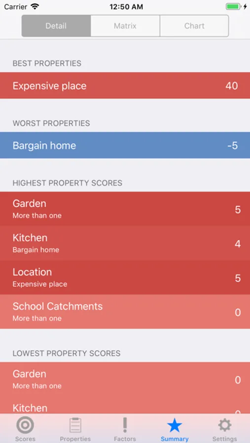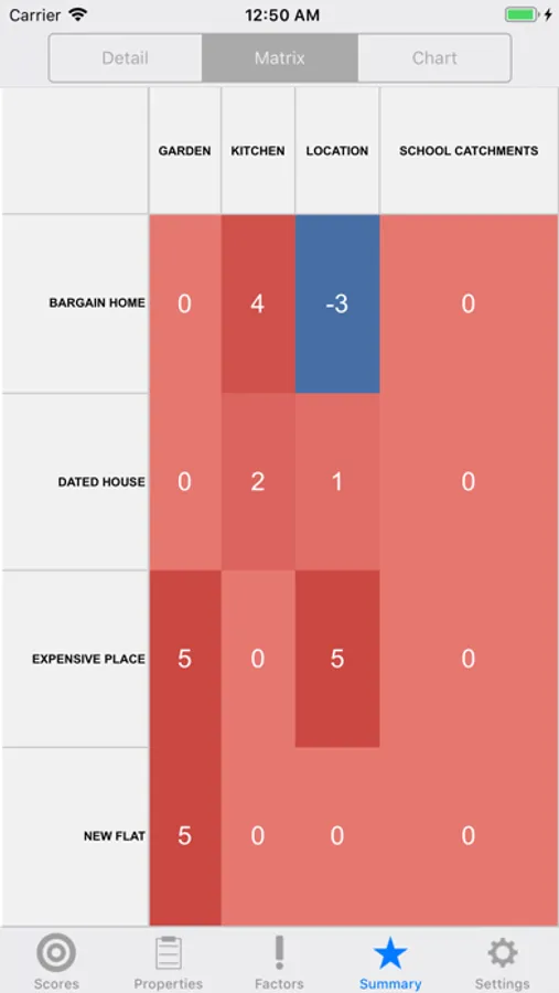 The app totals the scores for easy comparison, a matrix view gives a full overview of all properties against all criteria and a summary page allows you to clearly see your optimal choice