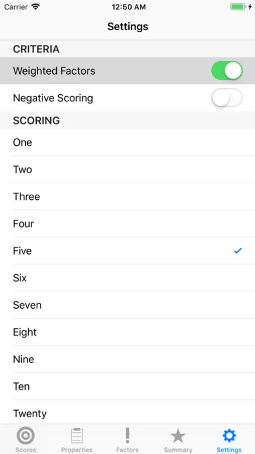 Once you've added your decision making criteria it's easy to then score a particular property against each factor, from -5 very poor to 5 very good.
