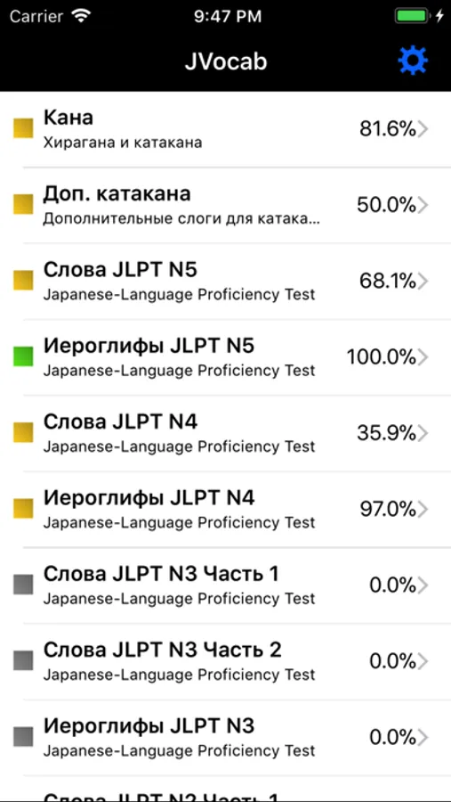 JVocab это бесплатное приложение без рекламы для изучения японского языка и японских слов. Процесс изучения (повторения) происходит в форме тестирования с выбором правильных ответов. Приложение имеет простой и оптимизированный для быстрого тестирования интерфейс.