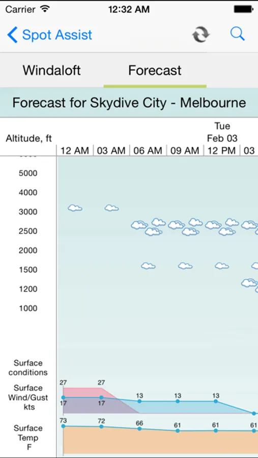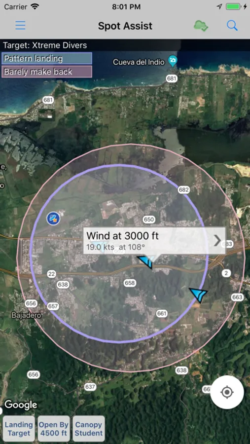 Shows skydivers current weather, winds, the best exit area and pattern in current wind conditions.