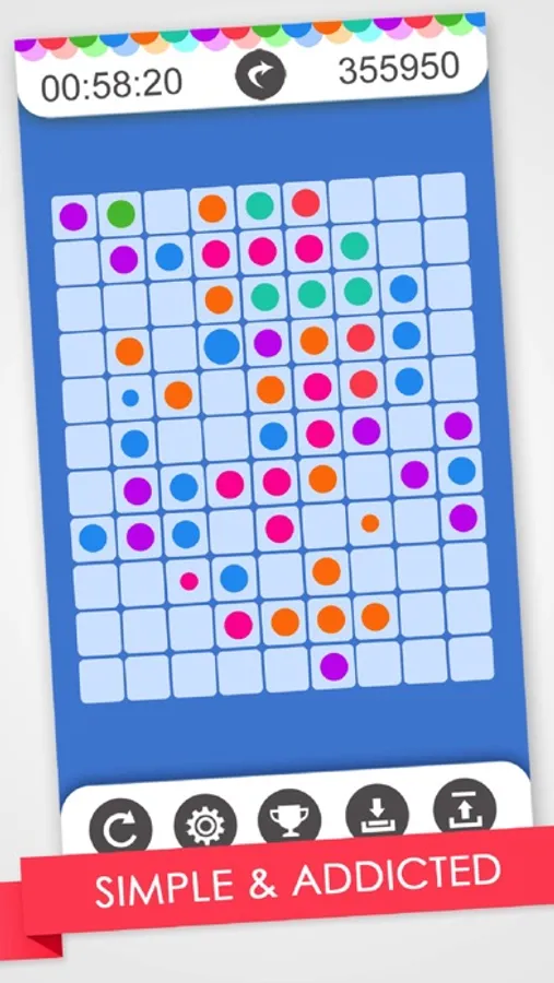 Lines 98 Classic is a simple interested classical game. The game starts with a 9×9 or 11x9(only on iphone 5, 6, 6+) board with three balls chosen out of seven different colours. The player can move one ball per turn, and the player may only move a ball to a particular place if there is a path (linked set of vertical and horizontal empty cells) between the current position of the ball and the desired destination.