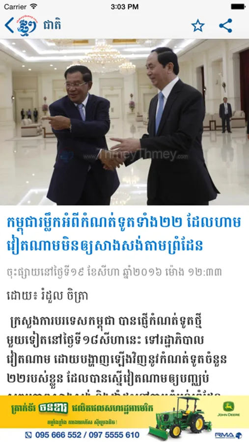 All latest articles are loaded and stored locally in the device so users can read news in offline mode without Internet connection. ThmeyThmey is a cambodia news website adhere to the principle of neutrality.