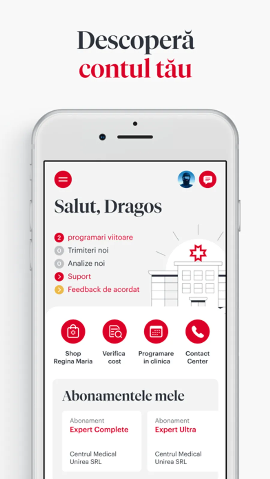Nu mai stai la coada la receptie! Accesezi butonul check-in online din DETALII PROGRAMARE si afli rapid etajul si cabinetul la care trebuie sa ajungi. Te indrumam la fiecare pas pentru a-ti oferi cea mai buna experienta pana la check-out inclusiv.