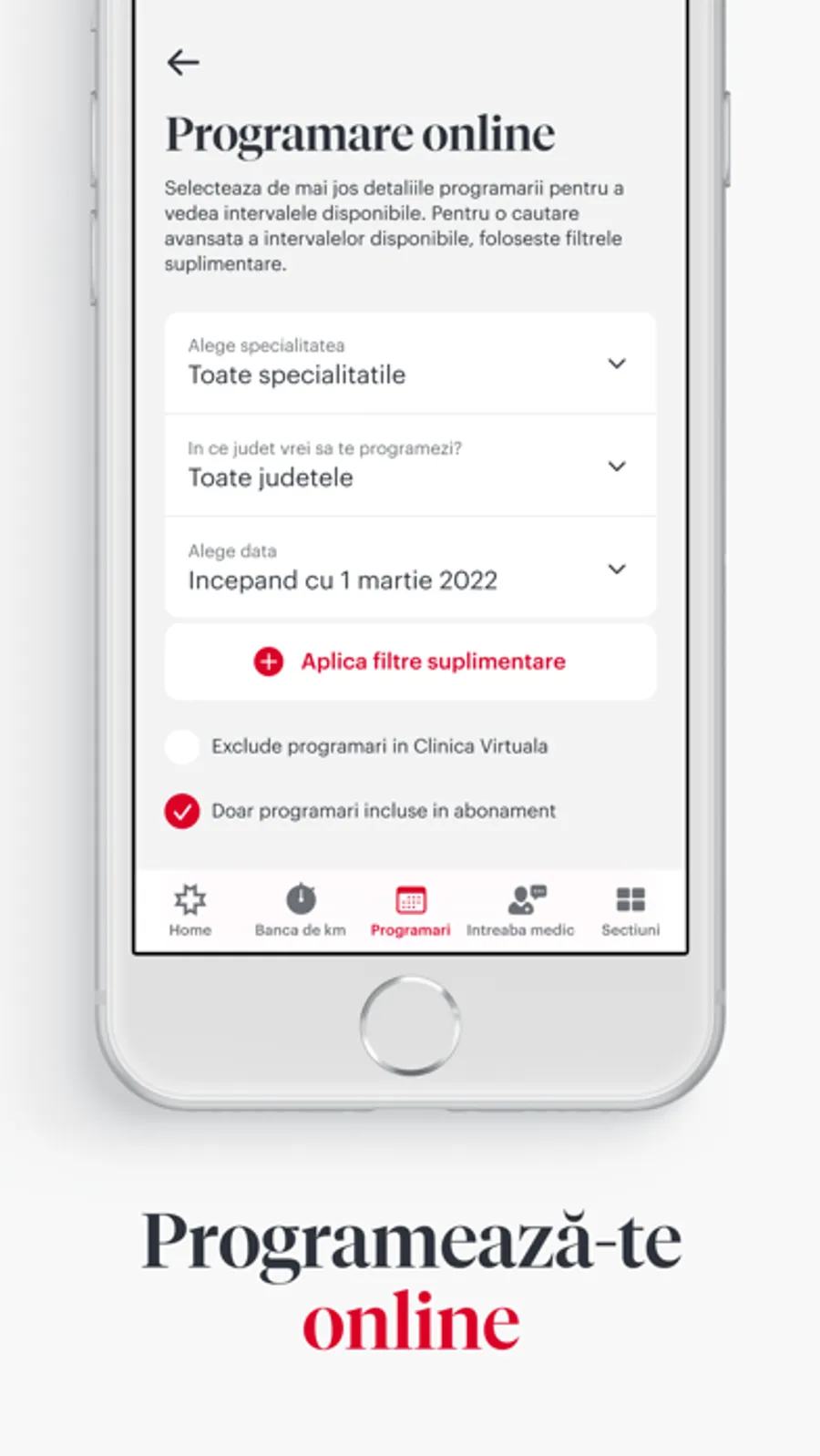 Iti optimizezi timpul programandu-te online! Ai disponibile in aplicatie doua alternative la sunatul in CallCenter: