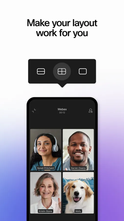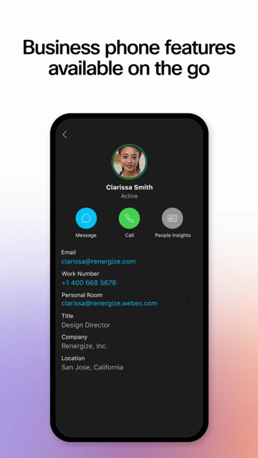 • Bring The Experience Into Meeting Rooms: Pair your app to a Webex device, such as the Webex Board, to do things like wirelessly control meetings and save whiteboard drawings