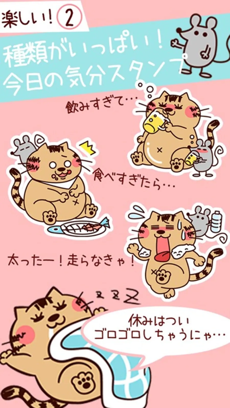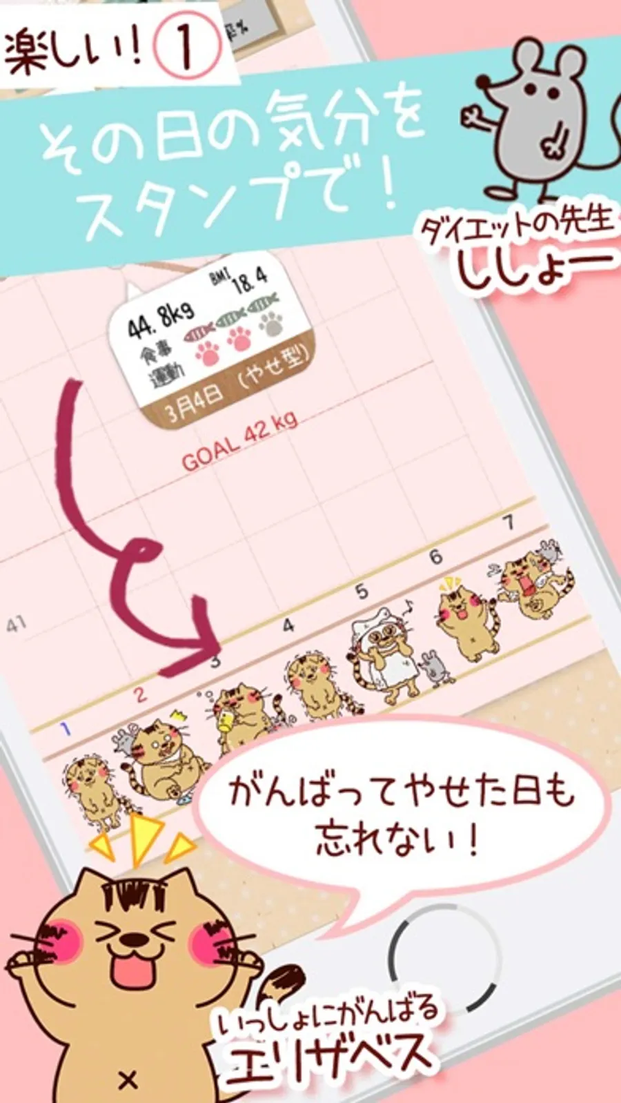 【ねこスタンプ】で【その日の気分】を記録して、かわいいネコと一緒に、楽しく続けられるダイエットを今日からはじめましょう!