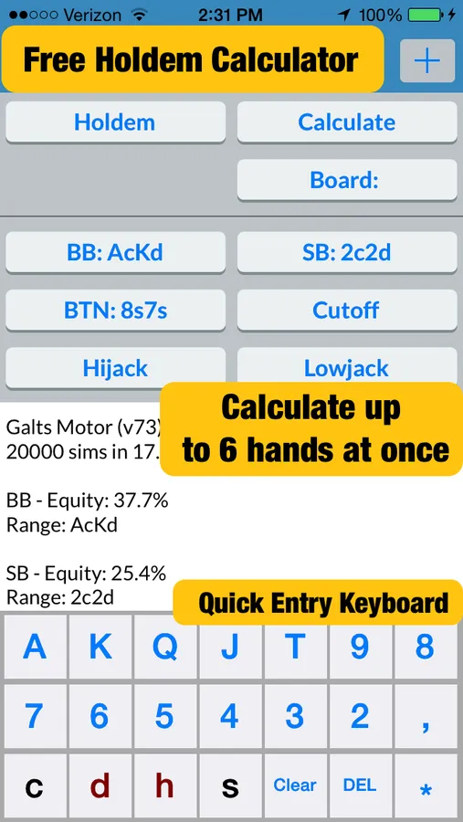 The free version of Galts includes Holdem and a free trial of all other game calculators. Streamlined entry makes entering cards quick and easy enough to review hands right at the table. Or use the Copy button to share hands with friends to discuss how you played it, show how unlucky you got, or how bad your opponent was.