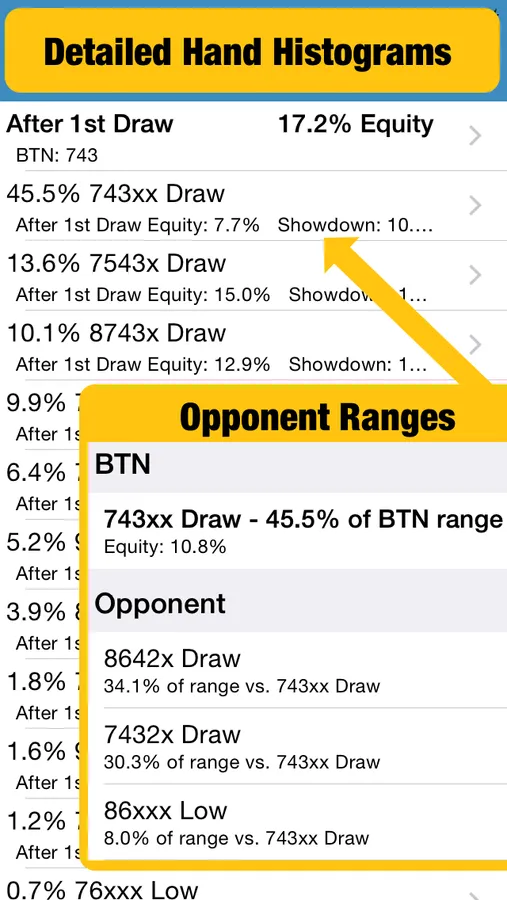 Hand Histograms: Review hand distributions and equities on each street. See how playable hands are by how often they can reach showdown, or fold before it.