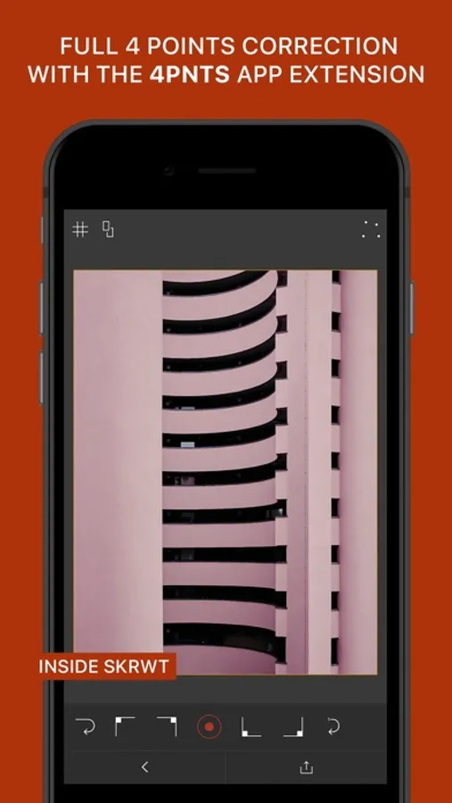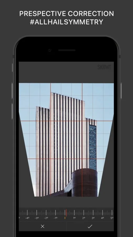 SKRWT (App Store's "Best Apps 2014") is the most powerful perspective- and lens correction tool out there. Crafted to help you enhance your best smartphone photos in just a few taps, v.1.5 of SKRWT is now better than ever. With a variety of unrivaled features and awe-inspiring in-app extensions MRRW and 4PNTS, this fine application is the go-to editing tool for sophisticated photography enthusiasts like yourself. All hail symmetry!