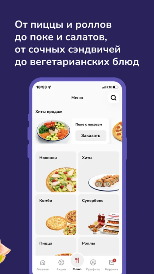 В меню вы найдёте более 40 видов пицц, а также роллы, суши, поке, сэндвичи, салаты, десерты и напитки на ваш вкус.