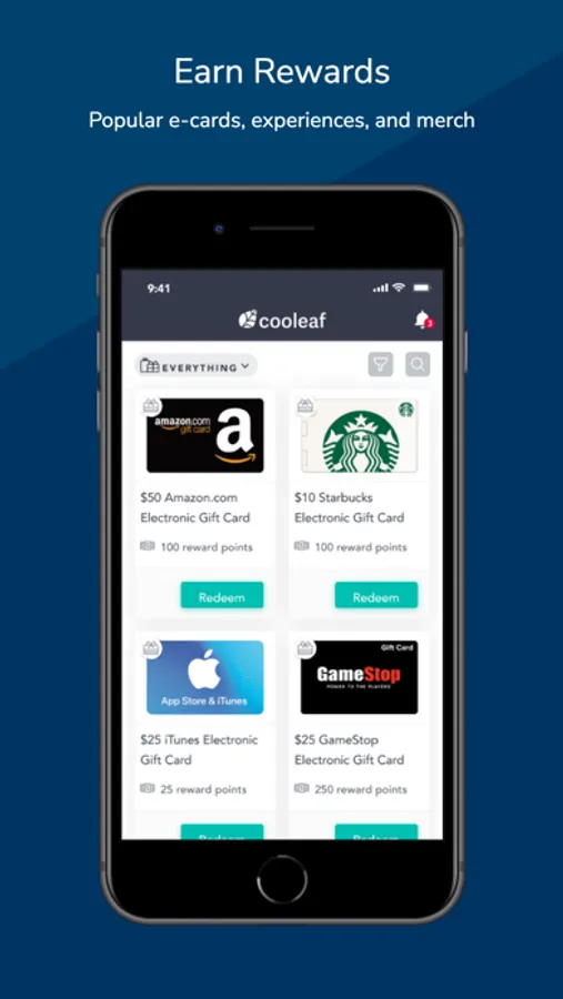 -Build a custom rewards catalog with branded merchandise, gift cards, charitable donations, experiences, and more (all fulfilled by Cooleaf)