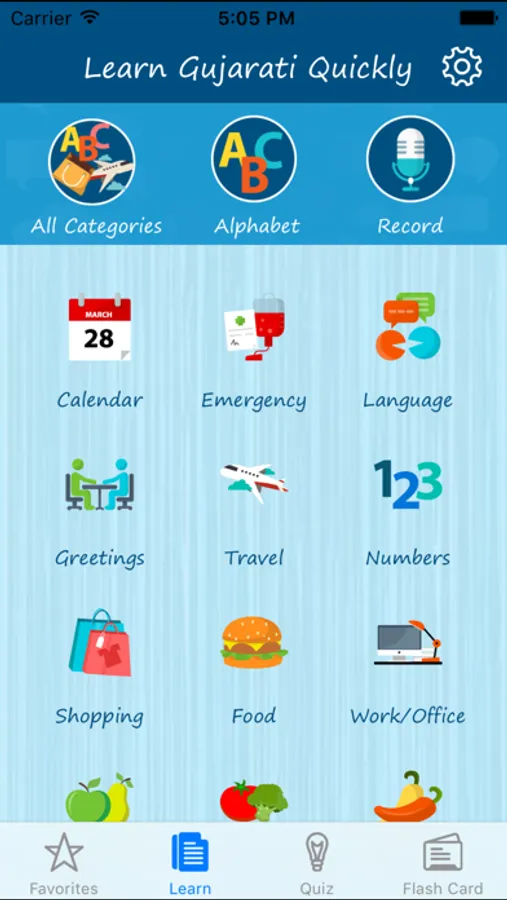 Learn Gujarati Quickly can also work as a travel app when you visit India. It can be your own travel guide with the most frequently used phrases and words on tour to India.