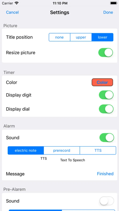 In addition, it is possible to set the color of the timer, the position of the title to be displayed simultaneously with the picture card (above and below the picture card), the message to be displayed at the end of the timer, and so on.