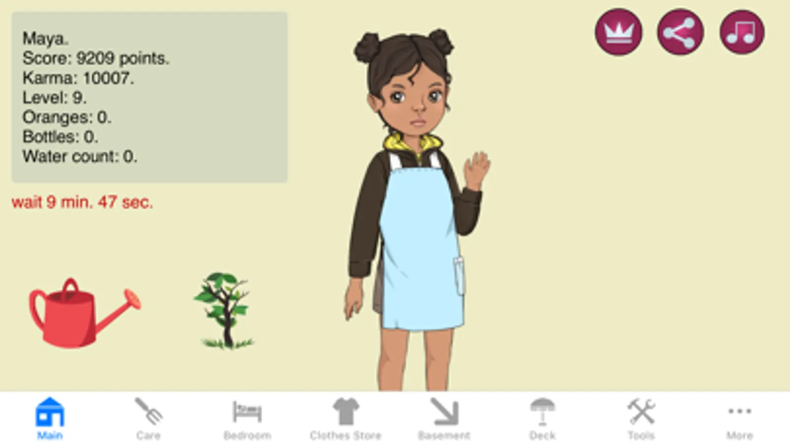 Choose a character, give water to the orange tree every day, harvest oranges, sell and earn money. Buy cool stuff for your house with money.