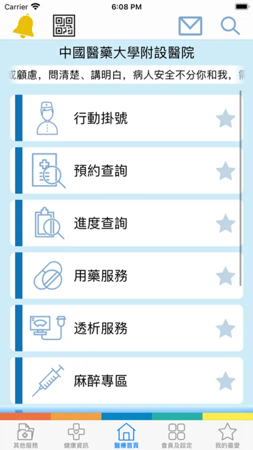 中國醫藥大學附設醫院為提供民眾更便利的就診服務,以及享有個人化健康管理,推出新版的APP ----- 中國醫點通 v3.0,讓您透過智慧行動裝置完成門診預約掛號、慢箋領藥等服務,並進一步掌握看診、領藥、檢查之進度,讓您不用親自到院查詢,大幅節省您的寶貴時間! APP也能利用智慧行動裝置的語音輸入功能,讓您用”說”的,也可以完成掛號! 除了上列功能,新版APP還有新增手機繳費及會員專屬服務,更加便利您的生活。