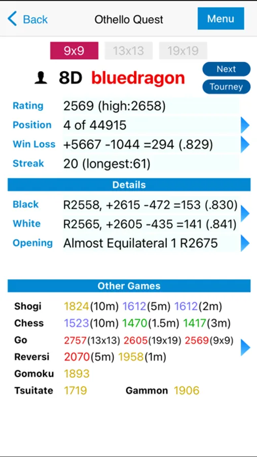 - Player's strength is rated by the popular Dan-Kyu system as well as more statistically accurate ELO-rating system.