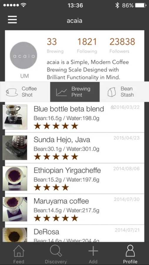 The Acaia coffee app provide a smart and easy way to record your coffee lifestyle, you can create a Acaia coffee brewing print, take a shot of your cup of joe or create a coffee bean note to share it with everyone. The Acaia coffee scale connects to the app, collects the essential coffee brewing data such as coffee bean and water weight, calculate the ratio and allows you to log the coffee brewing data in the app.
