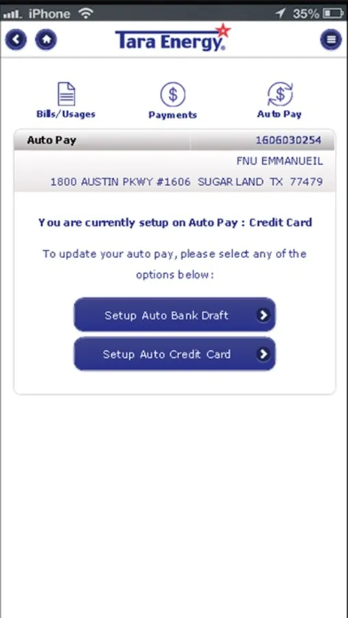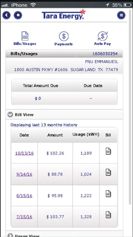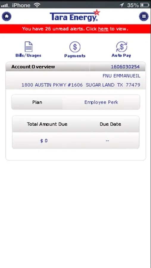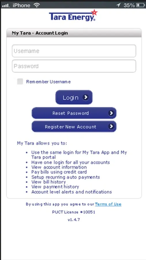 Tara Energy app offers access to view/pay bills, monthly usage & payment history through your phone or tablet device. To get started, download the app and sign in with your "My Tara" username and password. Not registered with "My Tara"? No problem, the Tara Energy app also allows you to register and provides the following features: Pay Bills – Effortlessly pay your bill through the app with your credit card. View Account Information – View your bills, electricity usage and account holder profile. Setup Recurring Auto Payments – Rest assured that your bill will be paid by seamlessly setting up auto payments through the Tara Energy app. Allow our app alerts to notify you when your payment has been received. View Bill & Payment History – Monitor your usage, view your billing & payment history. This also allows you to make sure past payments have been posted successfully to avoid any late fees. Alerts & Notifications – Receive bill alerts as soon as your Tara Energy bill is ready. Our friendly payment reminder notifies you days before your payment is due and when payments were received. For more information and to view our Privacy Policy, please visit www.TaraEnergy.com. Must be a current Tara Energy customer with a Texas service address. ©2014 Tara Energy, LLC. All rights reserved. PUCT # 10051.