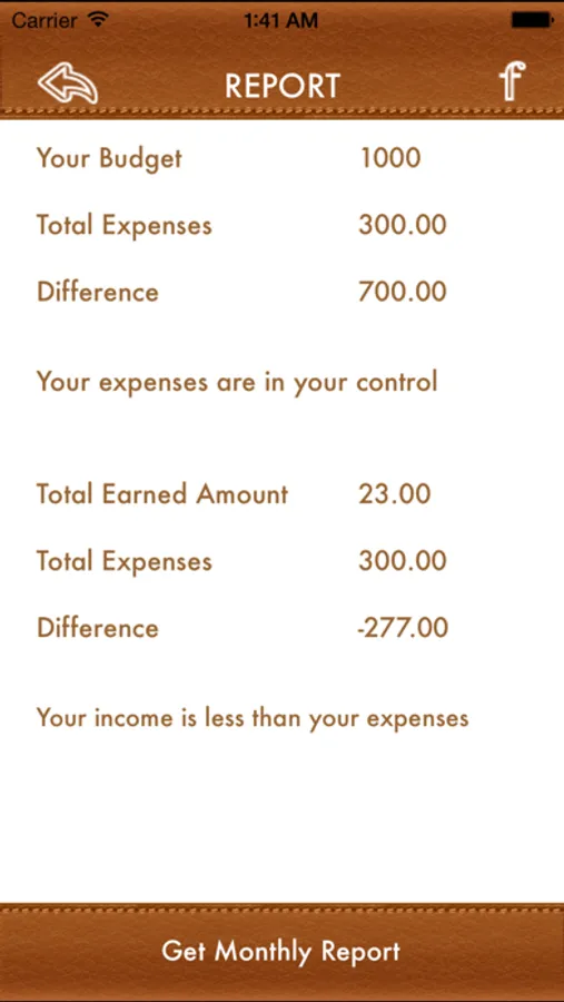 You can enter your monthly budget and in app's Report view you can see your monthly income and expenses.
