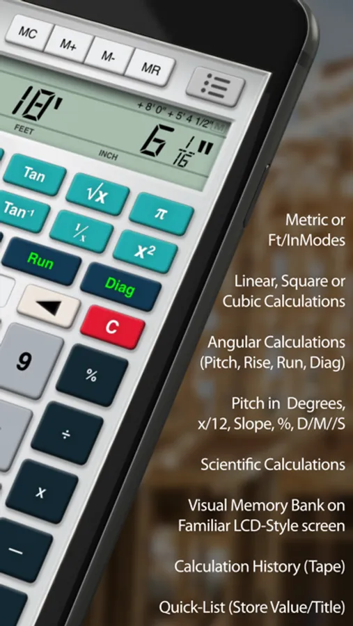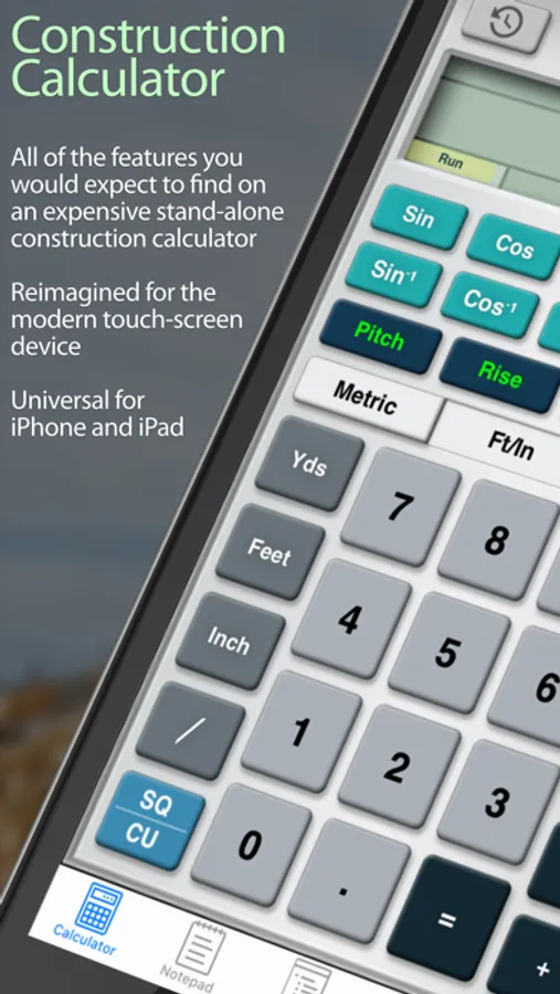 • Calculator: Includes all of the features you would expect to find on an advanced Construction Calculator, but redesigned and optimized for the touch screen.