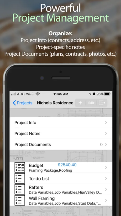 Not only does it keep track of important project info & create powerful lists, but you can also store project documents (like budgets, contracts, plans, etc.) & images (either by attaching images from you photo library or taking new ones).