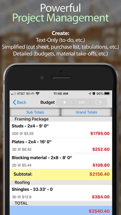 Create lists of data in Text-Only, Simplified, or Detailed lists, and store in organized Projects. Useful for take-offs, estimating, budgets, material lists, etc. Lists can even be tabulated to include running totals on the bottom!