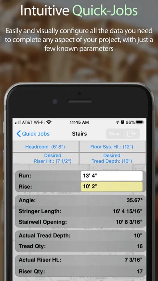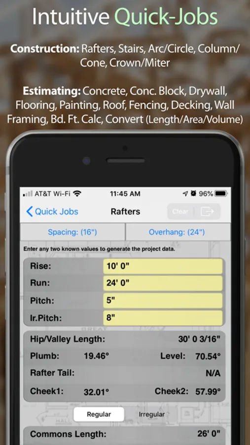 • Quick-Jobs: Graphical interface to easily calculate all kinds of construction projects, large or small. With just a few known parameters, Quick-Jobs will automatically fill-in and calculate the rest of the project for you.