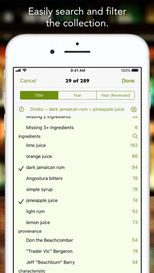 - Check off the ingredients you’ve got and this app will show you which drinks you can make