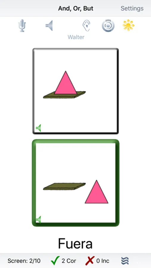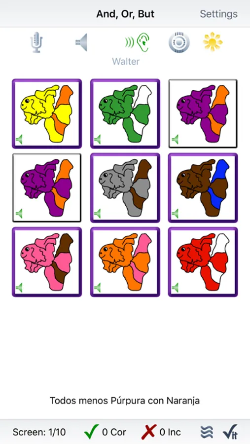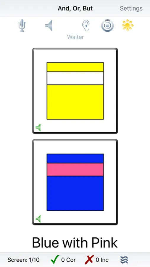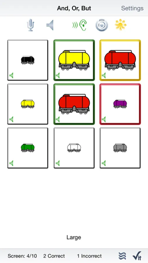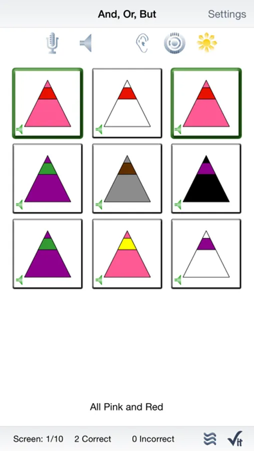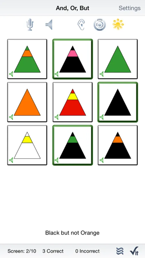 The Or task is a bit more difficult than the other tasks. In this task, the user hears the colors of two objects, but is asked to pick only one of them. The first two levels introduce the concept of one or the other but not both, with single colors. In the higher levels, the prompt contains two colors. Sample prompts would be either “Show Me Red and Blue or Green and Blue” or “Show Me Black and Purple or Green and Blue”.