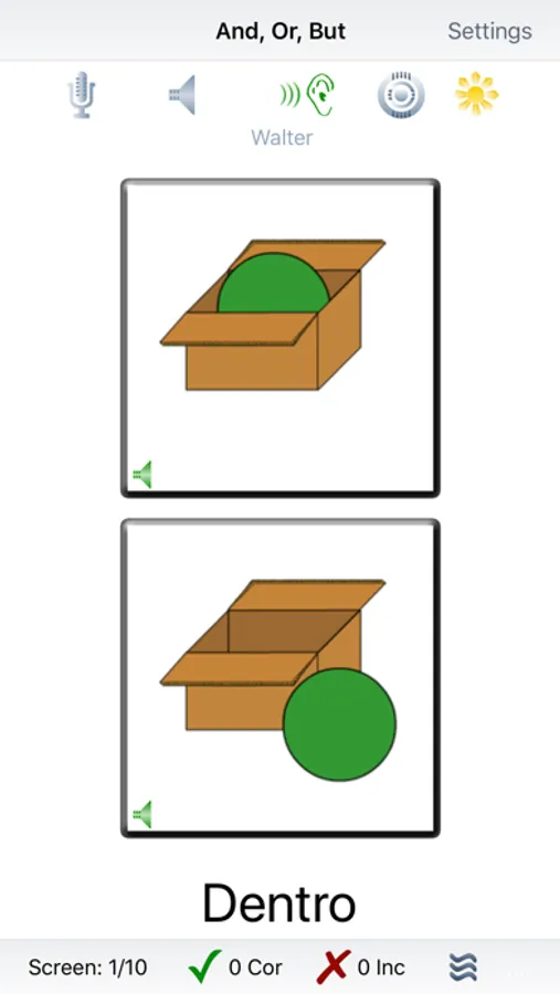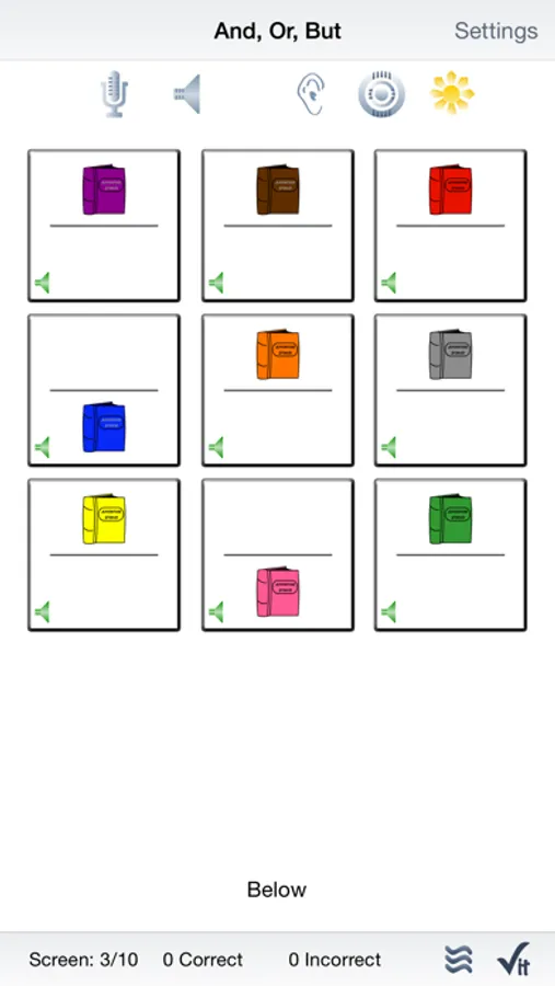 And, Or, But… requires the player to find the object on the screen that has a specified color, size, number, or spatial relationship. There are four levels of difficulty and seven tasks: And, With; Qualitative Relationships - Size; Quantitative Relationships - Number; Spatial Relationships; Or; Negatives; and Challenge.