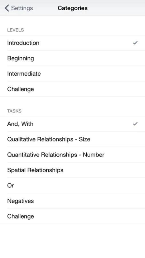 The Beginning level has four items on the screen. In this level, there is only one target but there is more variety in the kinds of items that are displayed on the screen. We also introduce the Check It button. In this level, and all higher levels, when the user taps on an item, the frame turns blue. The user must now complete the second part of the task, checking their answer. If the answer is correct and no incorrect items are highlighted, the frame of the correct item turns green. After a short delay, the next set of pictures is presented.