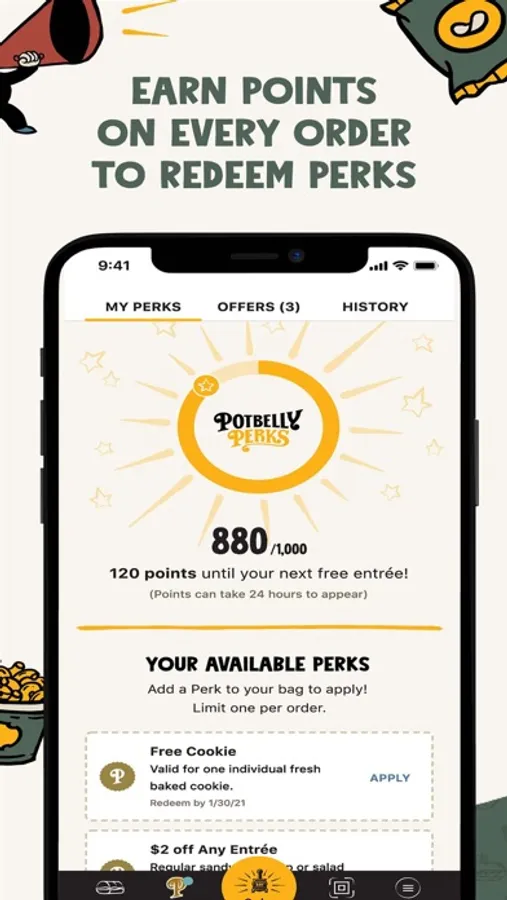 • GET FREE SANDWICHES with Potbelly Perks. Every order earns you points towards a free sandwich (or other entrée) - plus we'll drop freebies here and there just for being a member. Check your progress and start racking up points now.