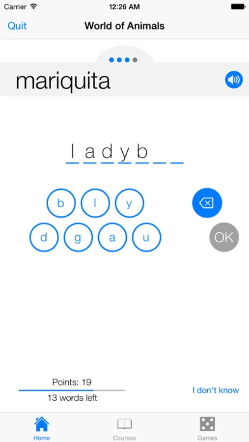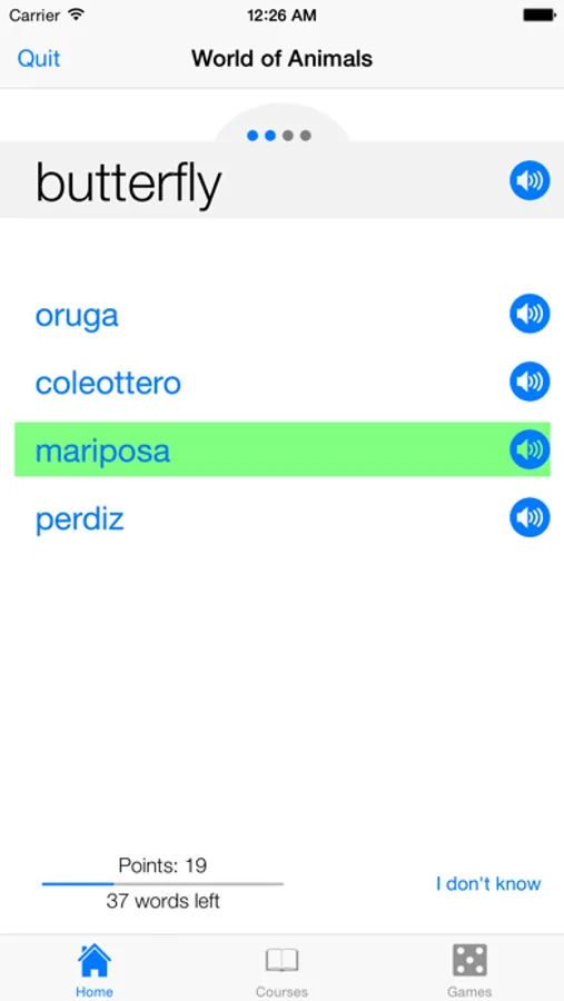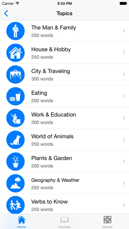 What it is however, is a really handy little app, which will help you learn the most important words of the language you choose. You'll be able to pick a topic (Man & Family, House & Hobby, City & Traveling, Eating, Work & Education, World of Animals, Plants & Garden, Geography & Weather, Verbs to Know, Adjectives to Know), start a game you prefer, and collect points. For these points, you can get new fun games. And before you know it, you've learned a bunch of new words. Sounds good? Well, it's not over yet: