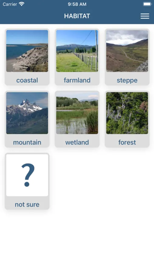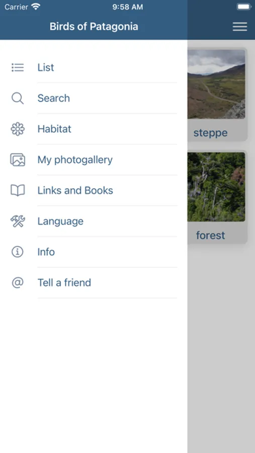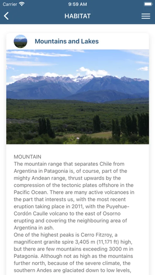 Tapping on the habitat button on the top-level menu provides a description of the main habitats of Patagonia, together with photographs.