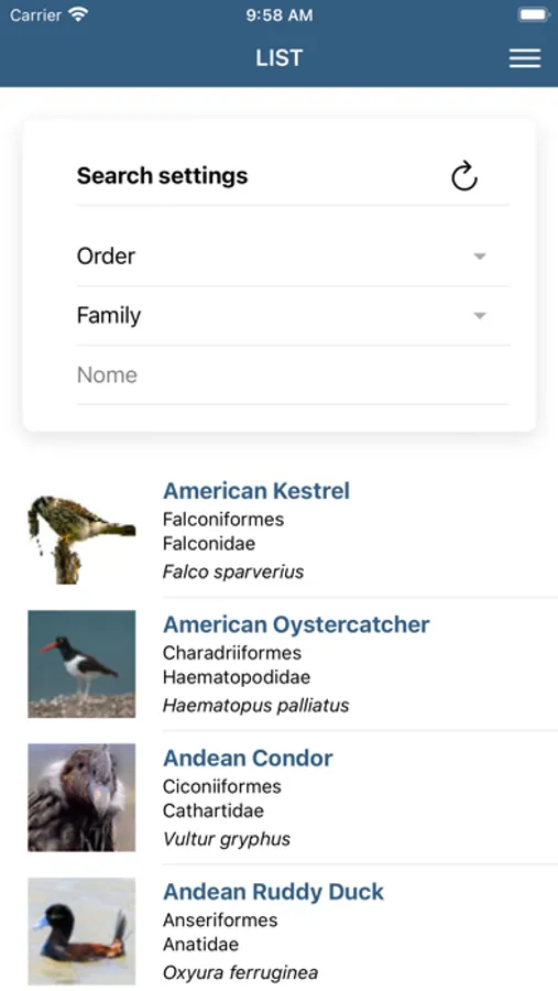 You can choose to see the birds listed alphabetically or select them by name, family or order.